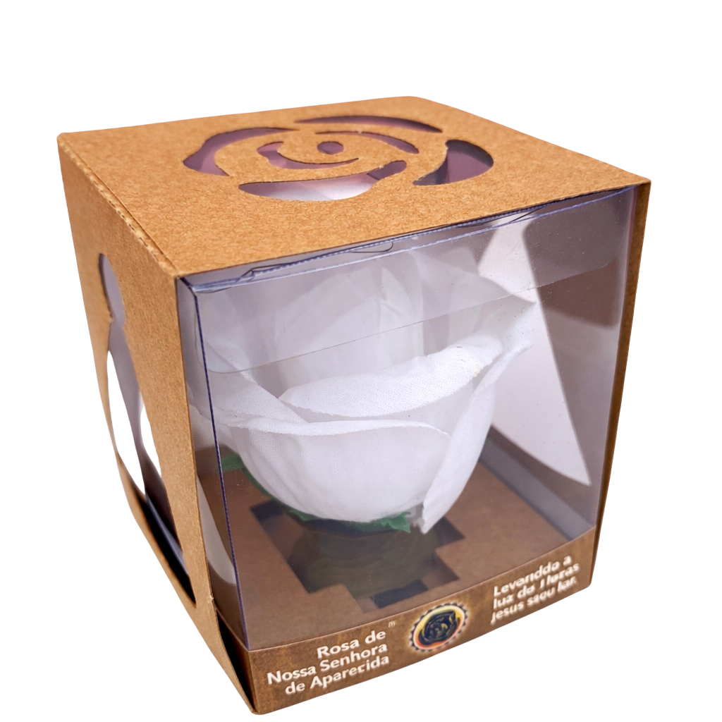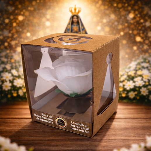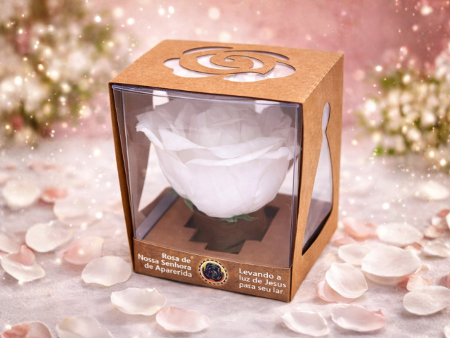 Escolhemos a rosa branca como símbolo da paz gerada por Maria e também pela grande simbologia da pureza da luz, o